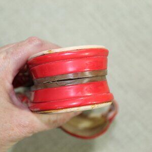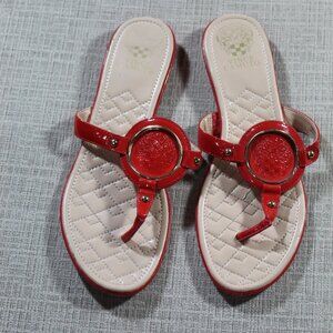 Red patent leather sandals by Vince Camuto! SO CUTE! Excellent preowned condition - one call out is a torn spot in the footbed that does not affect the wearability of the shoe. It is not visible when wearing. See the last picture. Otherwise, like new