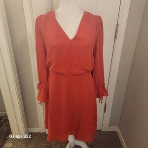 Vince Camuto Red/Pink Dress. NWT. Size: Various. Ties at above wrist. Zips down back to below waist. Fully lined. Material: 100% Polyester, so not much stretch. Extra button on interior tag. Smoke free home. No odors. All offers are welcome. Thank you! Color is red with a pink hue. Midi or Mini depending on your height