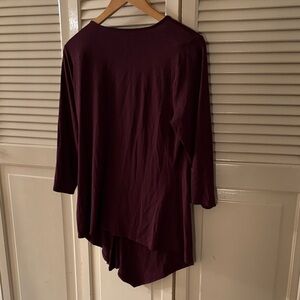 Chic burgundy top with 3/4 sleeves and stylish front gathering.