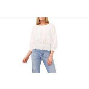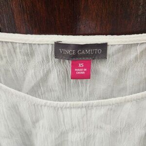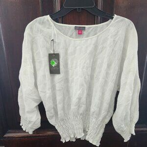 This Vince Camuto blouse, in a radiant white with a textured waffle pattern, epitomizes understated elegance. Its elasticized waist and cuffs offer a flattering silhouette, while the lightweight fabric ensures comfort and breathability. Perfectly suited for warm weather, the blouse combines style and practicality for an effortlessly chic look.