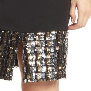 Vince Camuto Sequin Cocktail Dress size 12. Like new, only worn once to a work event, dry cleaned. Gold, silver, black sequins at the bottom with a stylish slit. Zip up back. Very comfortable. Lined. Perfect for a business event, cocktail, or wedding. See pictures for details. Pit to pit is approx 19 inches.