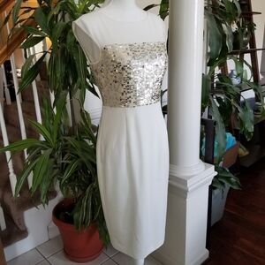 Vince Camuto eggshell colored sequined bodice dress. Dress is new with tags but has a couple of flaws. The button in the back is missing. I used a pin in the pictures. There is also a few dust spot just below the sequins. I didn't want to mess with it since it still had the tags on but I am sure it will wash out. Everything is in the pictures above. Measurements are approximate