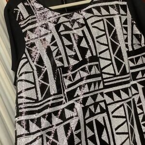 Vince Camuto sequined short sleeved top in a black and white abstract design.