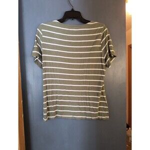 This is a Vince Camuto women's shirt in size Large, featuring green and white stripes with a cut-out neckline. It is a short-sleeve T-shirt made of spandex and rayon material. The design is colorful and vibrant, suitable for casual wear.