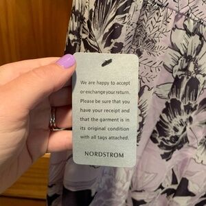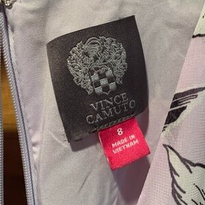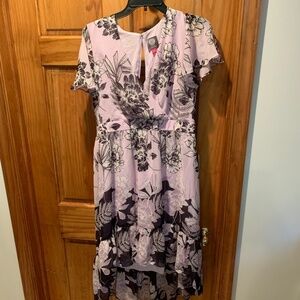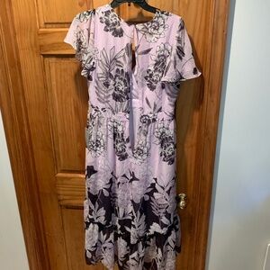 Vince Camuto Short Sleeve Chiffon Flutter Dress. Purple with floral print. Surplice neckline. Short flutter sleeves. Lined. High low hemline. Women's size 8. New with tags but the back zipper needs to be fixed.