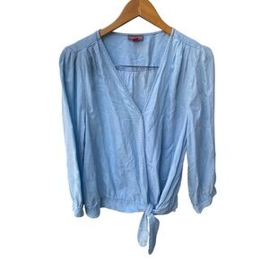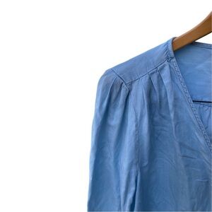 This wrap-style top features a flattering design that transitions smoothly from weekends to weekdays. Cut from sky blue touchable Tencel and enhanced with pleats and gathering, this top is a stellar choice for fall and beyond.