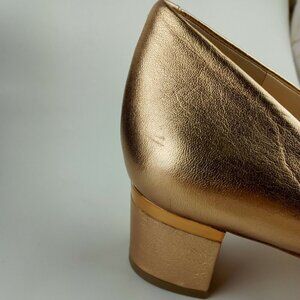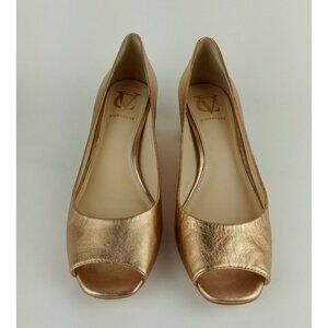 Vince Camuto Signature 7M Gold Metallic Open Toe Block Heel Shoes Lamb Leather