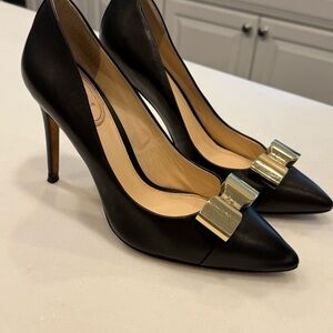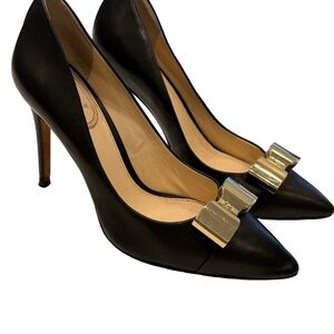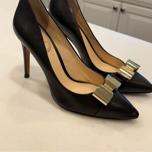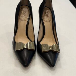 Excellent used condition. Women’s Vince Camuto Signature black leather heels / pumps with gold metal bow. 4” inch heel, slip on, leather upper & soles, gold metal logo on back. Size US 8 EU 38 made in Italy