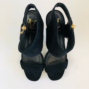 VC Signature Shaylee dress sandals in excellent condition with wear to soles and a few un-noticeable black ‘diamond’ chips missing on one zipper pull, see last pictures. Sexy black stiletto heel suede sandals with ankle cuff, gold side zipper with chunky jewel encrusted pulls. See pictures for heel height.