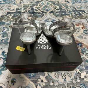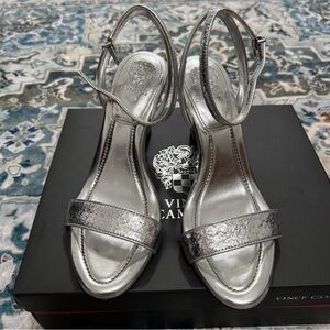 Elevate your evening ensemble with these Vince Camuto heels, featuring a sophisticated strappy design and a shimmering silver finish. The high heels and adjustable ankle straps ensure a secure and stylish fit, perfect for formal occasions.