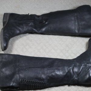 Beautiful black knee-high supple leather riding boots by Vince Camuto. Decorative laces at the back of the calf of the boot. Excellent preowned condition - gently used.