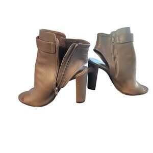 These designer Vince Brigham Peep Toe ankle booties feature a sleek open heel design and a sophisticated gray leather finish, perfect for adding elegance to any wardrobe.