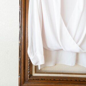 Vince Camuto blouse, white surplice top, draped front blouse, long sleeve chiffon top, office wear blouse, dressy casual shirt, women’s M blouse, white wrap front blouse, elegant work top