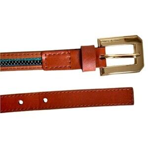 Add a splash of color to your outfits with this colorful Vince Camuto skinny belt, women's size Small. It's made of light brown/tan faux leather with an inset of turquoise, navy blue and beige tapestry in a stripe pattern. The shiny gold buckle has the Vince Camuto logo embossed on it. Whether heading to school, the city or stepping out for a festival, this belt brings a chic finishing touch to any ensemble. Very gently preowned - Nearly New!