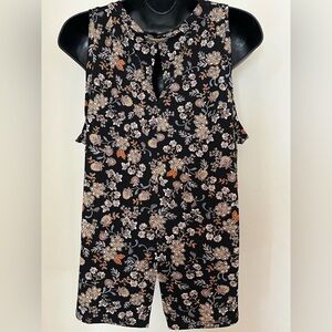 This Vince Camuto tank top features a sleek black base with vibrant orange floral accents, offering a stylish sleeveless design perfect for warm weather. Like new, dry cleaned only and in perfect condition.
