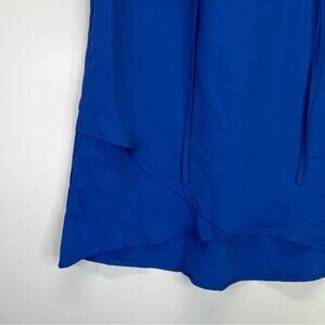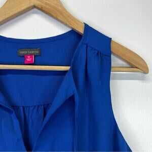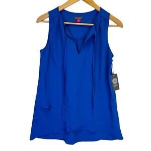 Beautiful sapphire blue blouse from Vince Camuto. Split Crewneck enhanced with a self-tie closure for a refined look. Sleeveless designed for a sleek and modern appearance. A-line silhouette provides a flattering and timeless shape. High-low tulip overlap hem adds a stylish and contemporary touch. Shirring at back yoke delivers subtle yet sophisticated detailing. Pullover style.