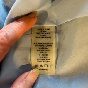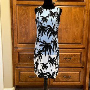 This fully lined sleeveless sheath dress is perfect for day or night. Like new condition in beautiful black, blue, and white tropical print. Polyester. Machine wash. 35 inch length.