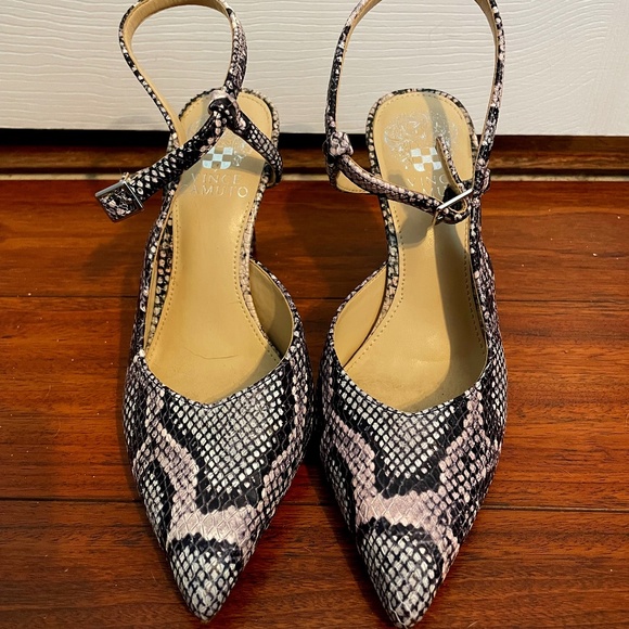 Size 6 Vince Camuto heels that are snake patterned with a combination of gray, pink, and blue throughout. Buckles at the ankle. Only worn once.