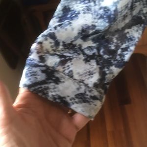 Fully Lined. Semi-sheer Blue/Black/White Print