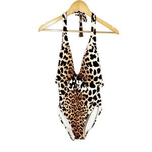 Make a statement in the Vince Camuto Tie Front Halter One Piece. This chic silhouette features tie front detailing, a tie neck strap and wild cheetah print.