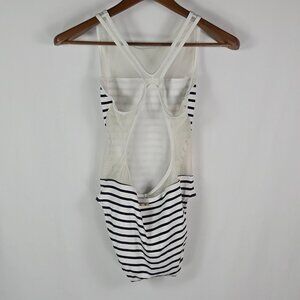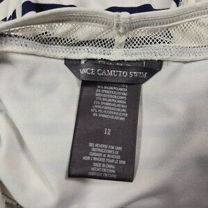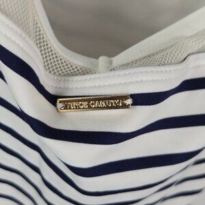 Vince Camuto one-piece swimsuit featuring classic navy-and-white stripes with sheer mesh paneling for a modern, elevated look. Designed for a flattering fit with racerback cut-out detailing and stretchy fabric for comfort and ease of movement. Perfect for vacations, cruises, and summer lounging. Pre-owned, excellent condition with no visible flaws.