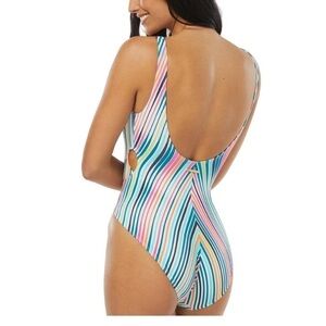 Vince Camuto Womens Striped Cut-Out One-Piece Swimsuit