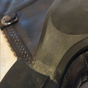 Step out in style with these chic black leather knee-high boots. Featuring a studded design and sleek finish, they are perfect for any occasion. Photo of missing stud on second photo 😬