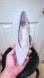 3.5 inch heel. Soft suede upper. Pointed toe. Light grey color.