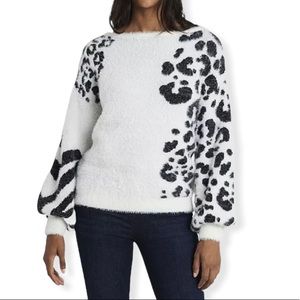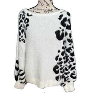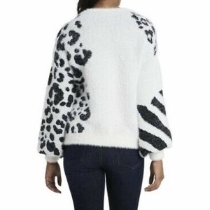 Beautiful white Vince Camuto sweater with gorgeous leopard/zebra print, faux fur, very cozy. New with tag. Pit to pit 22”.