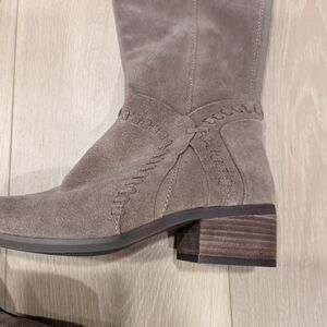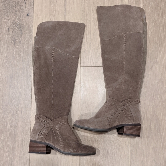 Classic tall riding boots crafted in soft suede with decorative whipstitch detailing. Features a comfortable stacked heel and elegant knee-high silhouette. Perfect for everyday wear with jeans or dresses.