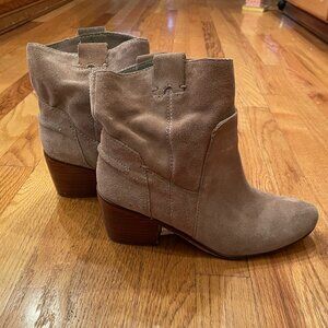 Vince Camuto tan booties in size 8. Small marking on heel as pictured. Small line on boot suede as shown in last picture. In good condition.