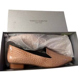 These Vince Camuto flats feature a sophisticated crocodile-embossed leather in a chic tan color. With a sleek, pointed toe and a minimalist slip-on design, they offer both elegance and practicality for everyday wear. New in box! Size 9
