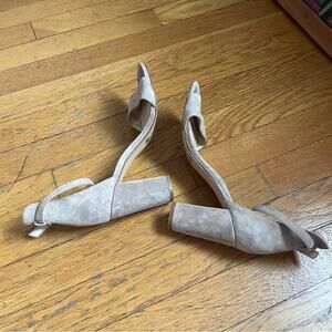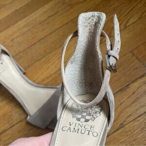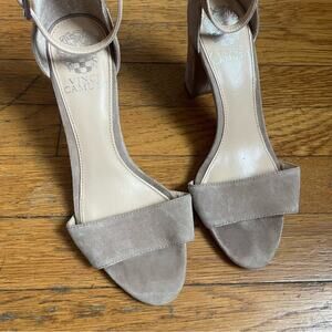 Elevate your style with these Vince Camuto tan heels, featuring a sleek ankle strap and a minimalist design. The open-toe and medium-height heel make them perfect for both formal and semi-formal occasions. Crafted with clean lines and a classic silhouette, these sandals offer timeless elegance.