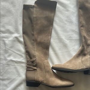Worn once! Elevate your style with these Vince Camuto over the knee boots, crafted in a sophisticated tan suede. Featuring a sleek silhouette and subtle buckle detailing, these boots offer a perfect blend of elegance and practicality for everyday wear.