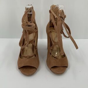 Vince Camuto Tannen peeptoe sandal block heel shoe tan suede ankle tie strappy 9