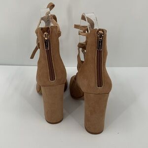Vince Camuto Tannen peeptoe sandal block heel shoe tan suede ankle tie strappy 9