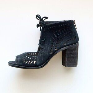 Vince Camuto Tarita Black Suede Laser Cut Lace Up Block Heel Bootie Shoes 6.5