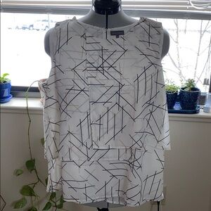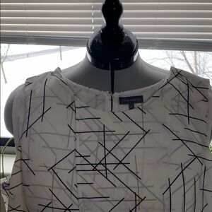 This is a sleeveless tiered/stacked shell/blouse. The blouse features multiple layers of fabric to create an asymmetrical tiered look. The shell is made by Vince Camuto.