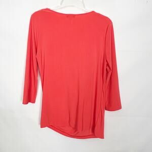 Vince Camuto women's pullover side draped top in orange. 3/4 sleeves. Scoop neck. Stretch. In good used condition. No stains, tears or holes.