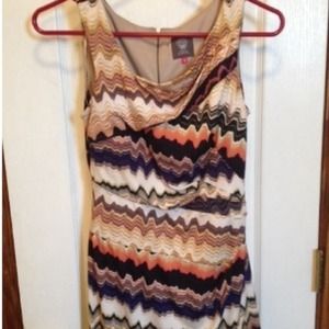 The dress is by designer Vince Camuto. The dress stops slightly above the knee and features an Aztec print with an array of colors such as Tan, Orange, Blue, Green, etc. The dress has a built-in liner and is a Size 2, but can probably fit someone who is a Size 4(like myself) as well. It can be dressed up with heels or dressed down with sandals. A blazer is the perfect compliment to this dress. I purchased the dress for $130 from Dillards, but I'm willing to sell it for $85.