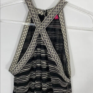 Elite construction and fabulous patterning come together to create this Vince Camuto Tropic Heat Fringe Tank Top. Aztec print pattern trim constructs a halter-style crossing neckline that creates a sleeveless silhouette. Lightweight embroidered prints add some style on the relaxed bodice that leads to a fringe trim bottom hemline. The look is finished off with a flirty keyhole cutout at the upper back.