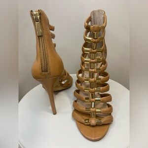 Vince Camuto Troy Gladiator Heels 6.5 Tan Leather Strappy Gold Accents Sandals