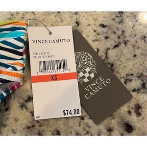 Put a fashionable twist on your swim style with the Vince Camuto Twist Front High Leg Bikini Bottom in a colorful stripe print inspired by a rainbow hitting the shores of Las Palmas.