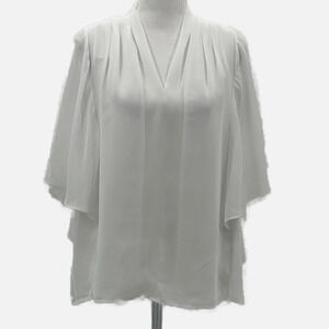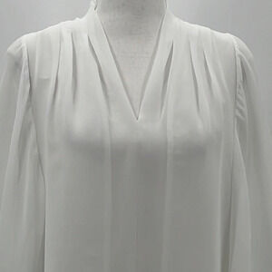 Vince Camuto V Neck Romantic Flowy Blouse in White - Size Small. Excellent pre-owned condition. On very tiny thread pull on the back of the left sleeve, shown in pic. Was new with tags but had a small spot on it so I washed it, hung it to dry and steamed it. Lined, V neckline, pleating at shoulder seams, flowy dolman type sleeves, straight hem with side splits. Approximate measurements: 18" bust, 24" length. Sold at Nordstrom. It's a popover blouse.