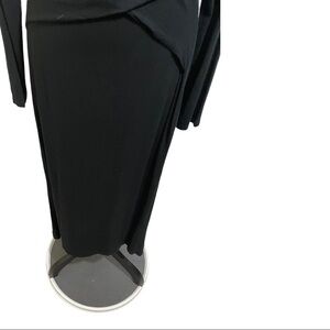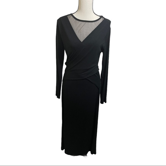 Vince Camuto V neck collar with net pattern. Long sleeve faux wrap Maxi dress . Black size medium. 96 Rayon