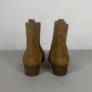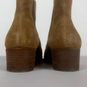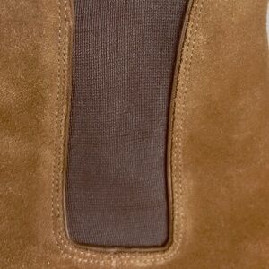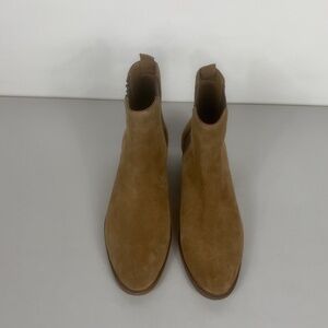 Vince Camuto VC John Camuto genuine tan suede ankle booties with double elastic side panels & pull tabs for easy slip-on wear. Cushioned footbed and short heel provides all-day comfort. Durable construction with a leather outsole with stitching and nail detail. Rubber pad inlay on the outsole for traction. A versatile ankle bootie for both professional and casual settings. Good condition, minimal wear and only worn a couple of times. Please reference the photos for condition of boots. No box.