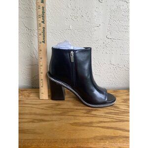 The Vince Camuto open-toe booties blend elegance with style. The black leather construction is complemented by a chic block heel, perfect for making a statement. The durable design ensures lasting wear, while the chain detail adds a touch of sophistication. An ideal choice for modern footwear collections.