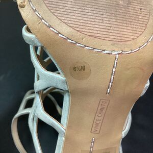 These shoes are in great condition! Minimal wear, inside and out! They are leather, shimmery silver, with a thin, strappy look, ankle buckle, and stiletto heel. Women's size 6.5 M.