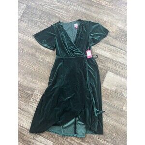 This stunning Vince Camuto dress in a beautiful hunter green color is perfect for any occasion. The dress features a V-neckline, short sleeves, and a zip closure. The faux-wrap style adds a touch of elegance and sophistication, making it ideal for weddings, parties, formal events, or even business meetings.