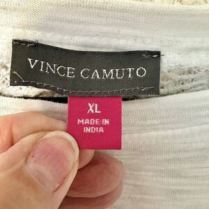 This Vince Camuto blouse is a stylish and classic piece perfect for a beachy look. It features a solid white color with lace sleeves, a round neckline, and a regular fit in size XL. Made from a lightweight cotton blend fabric with lace accents, this blouse offers a designer touch to a basic style. The Vince Camuto brand and the classic design make it a versatile choice for women looking for a chic and comfortable top.